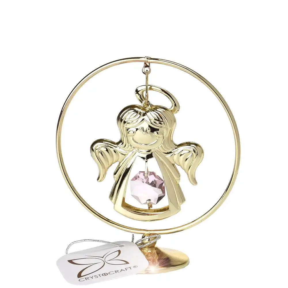Anděl v kruhu na stojánku s růžovým křišťálem - pozlacený