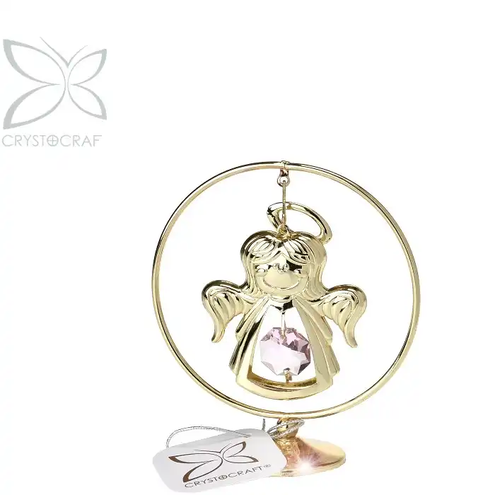 Dekorační anděl na stojánku v kruhu s růžovým křišťálem přináší jemnou a elegantní dekoraci, která podtrhne klidnou atmosféru domova. Anděl o výšce 8,2 cm vyniká pozlaceným provedením, čistými liniemi a jemným detailem růžového křišťálu, který dodává celé dekoraci výjimečný vzhled.