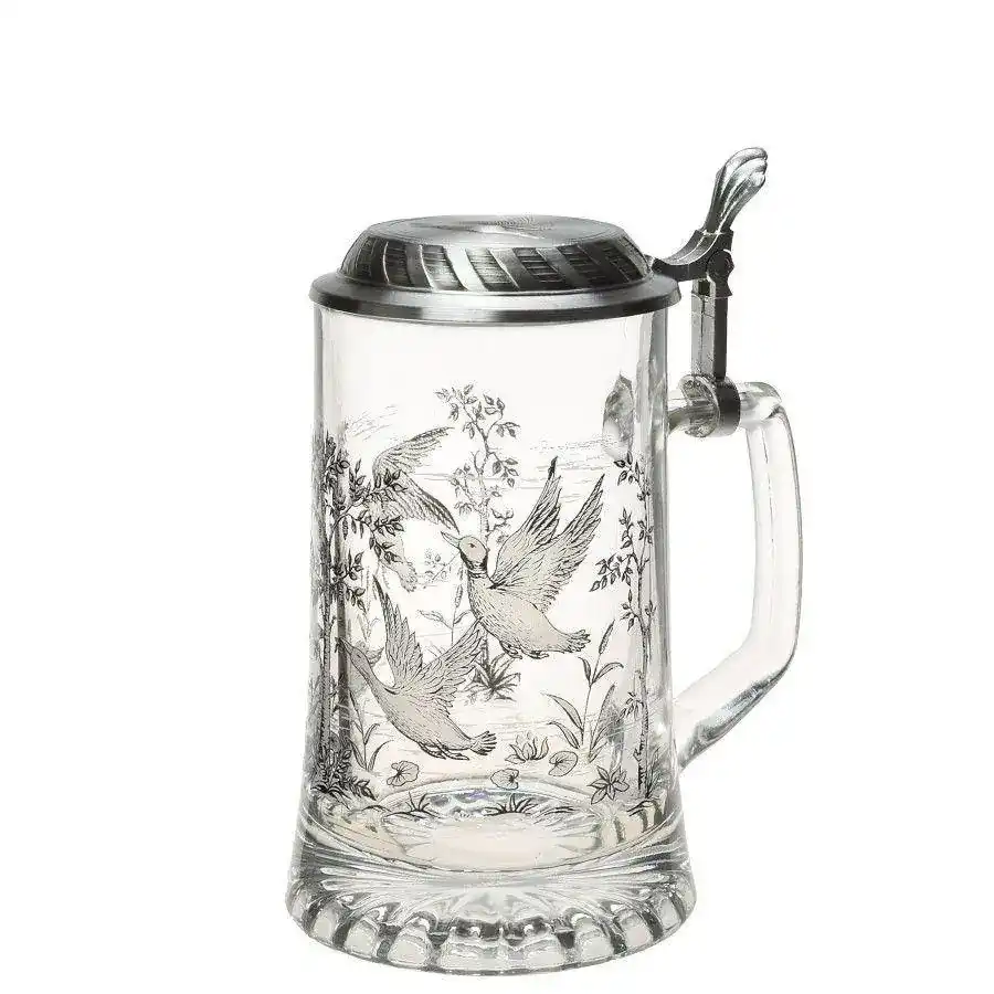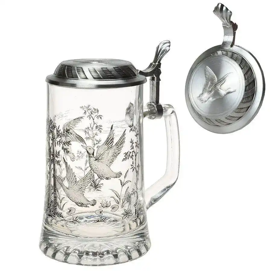 Výrobce použil odolné sklo a cínové víčko, které chrání nápoj a dodává celému kousku historický nádech. Výjev s divokými kachnami zaujme jemnými odstíny a připomíná malý obraz, který každý myslivec rád vystaví. Tento půllitr skvěle poslouží při odpočinku po honu i jako dekorace do domácího baru nebo na chalupu.
