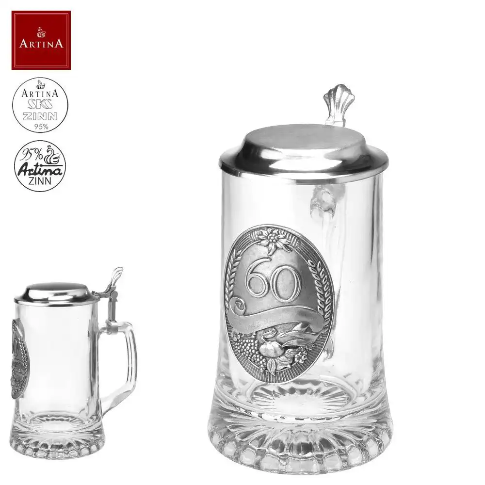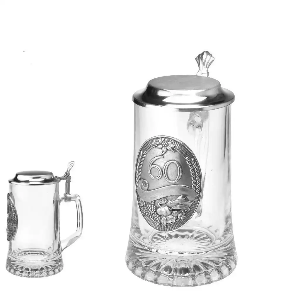 Tento skleněný korbel s masivním uchem a cínovým víčkem není jen na ozdobu. Je pevný, praktický a připravený na přípitky všeho druhu – od piva po domácí limonádu. Plaketa s číslem 60 na přední straně jasně značí, že právě tenhle půllitr patří výjimečnému člověku.