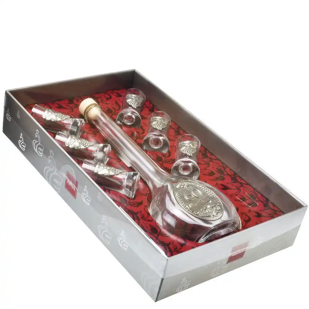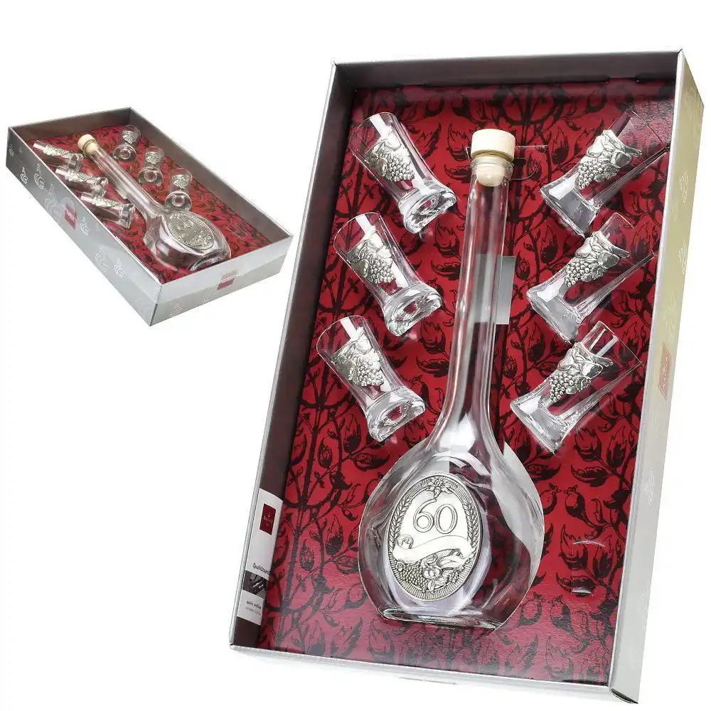 Nápojový set pro muže k 60. narozeninám představuje důstojný a stylový dárek, který udělá radost každému milovníkovi kvalitního destilátu. Tato luxusní souprava obsahuje skleněnou láhev s dlouhým hrdlem a šest štamprlí, všechny ozdobené cínovými detaily. Dominantou je masivní plaketa s číslem 60, která dává jasně najevo, že tento dárek patří skutečnému oslavenci.