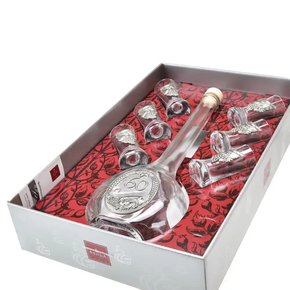 Šedesátka je okamžikem bilancování, oslav i výjimečných chvil s přáteli. Tento nápojový set k 60. narozeninám je přesně tím dárkem, který podpoří slavnostní atmosféru – a navíc zůstane jako trvalá památka. Láhev je ozdobena výraznou cínovou plaketou s číslem 60, zatímco každá sklenička nese drobný, ale detailně zpracovaný reliéf hroznu – symbolu plodnosti, vína a radosti ze života.