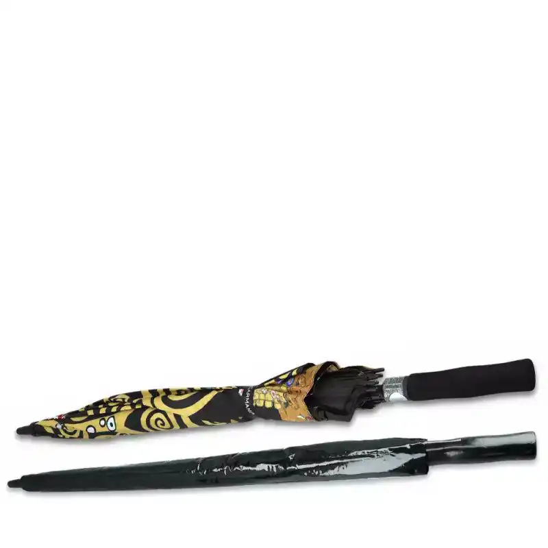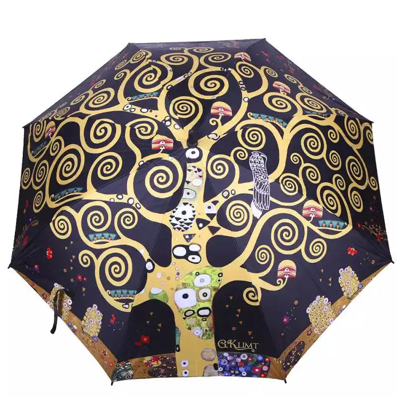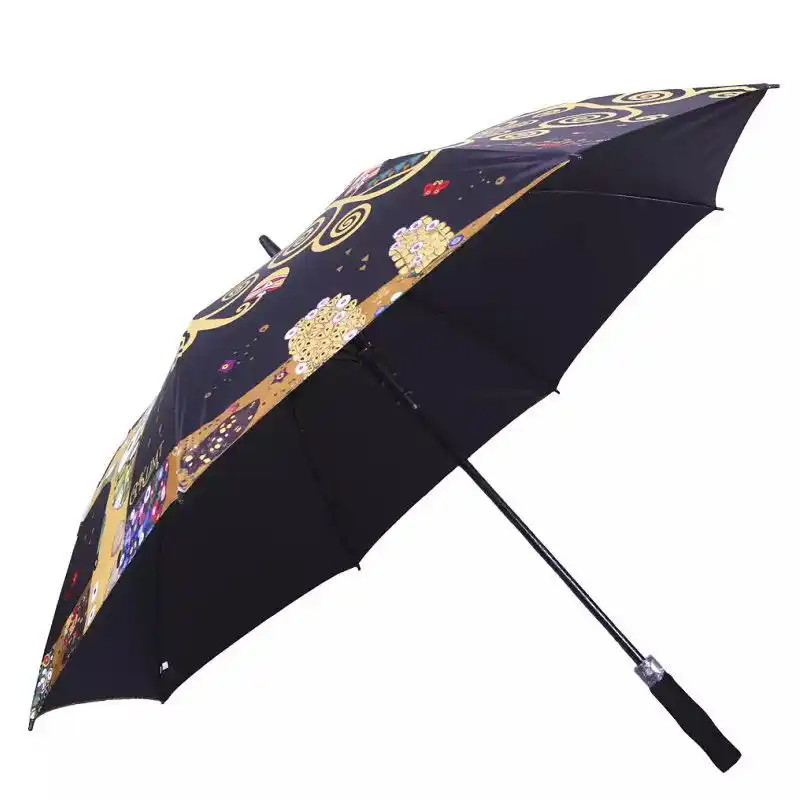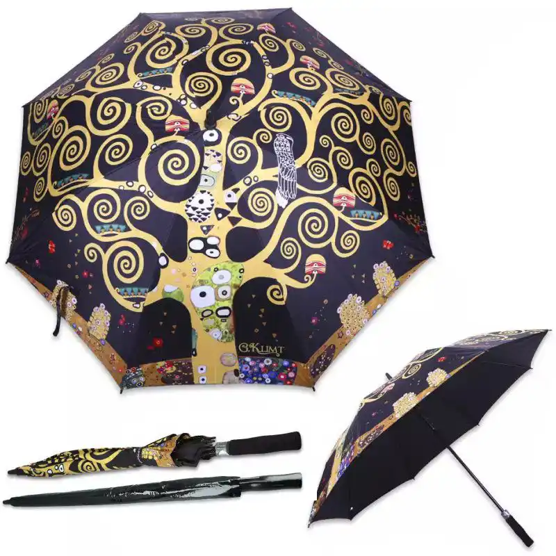 Z vnější strany zdobí deštník Klimtův motiv „Strom života“. Zlatavé tóny, stylizované větve a jemné ornamenty působí luxusně a originálně. Vnitřní strana je černá, což vytváří kontrast, který podtrhuje eleganci a zároveň zvyšuje univerzálnost deštníku – hodí se k jakémukoli outfitu. Tento design z něj činí nejen praktickou ochranu před deštěm, ale i módní doplněk.