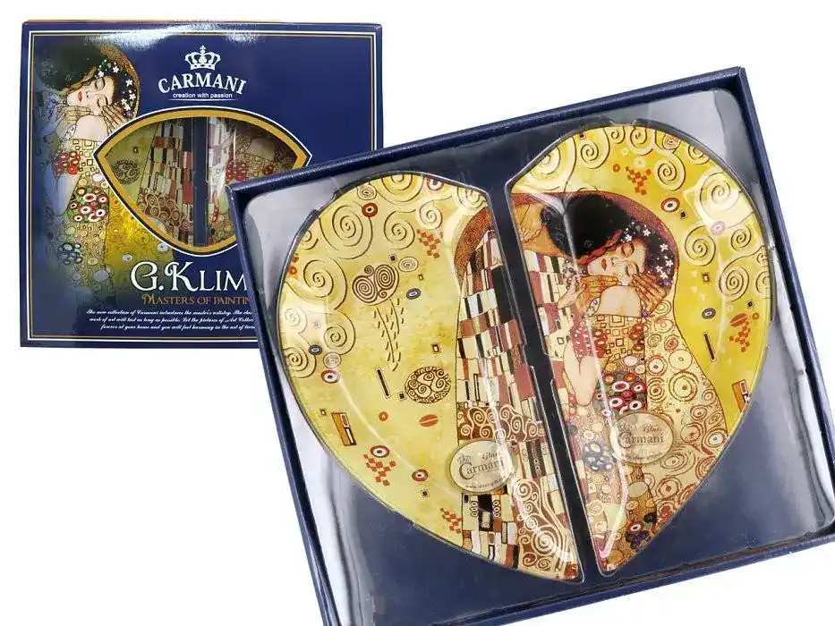 Elegantní skleněné talíře Klimt s dekorem Polibek ve tvaru srdce. Sada 2 kusů v dárkovém balení je ideální pro originální servírování i jako luxusní dárek.