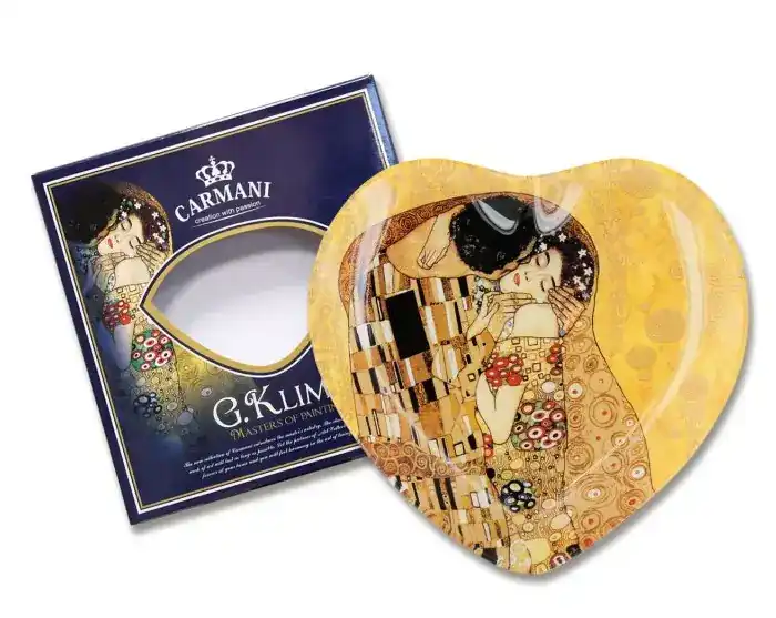 Romantický skleněný tácek Klimt s dekorem Polibek ve tvaru srdce (19 × 18 cm) je elegantní doplněk i originální dárek. Zabalený v dárkovém obalu, potěší milovníky umění a secesního designu.