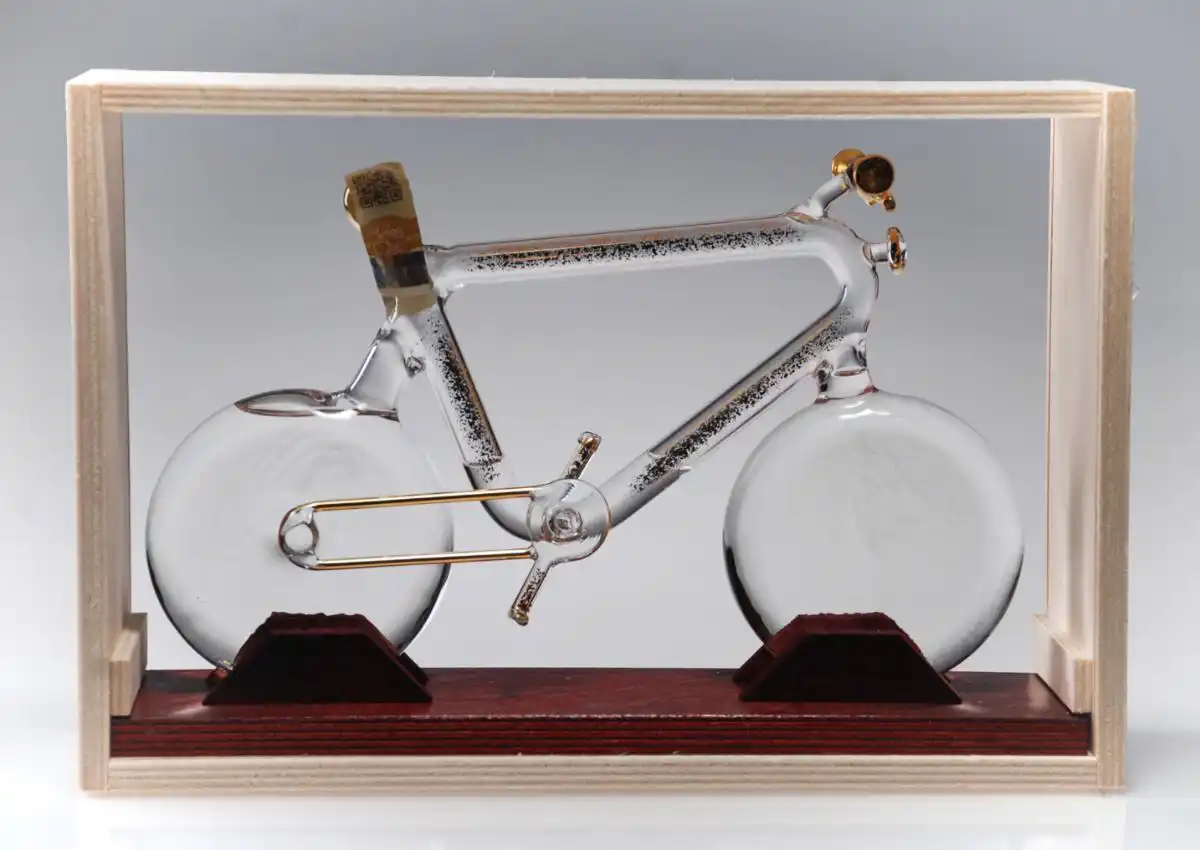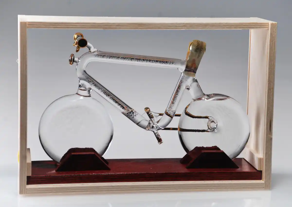- ručně foukaná luxusní skleněná láhev ve tvaru silničního kola se zlacenými detaily