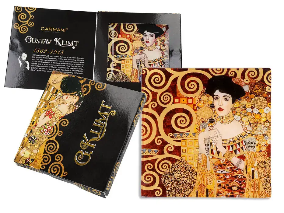 Dekorativní talíř s motivem Adele přináší do stolování spojení umění a praktického využití. Skleněný čtvercový talíř o velikosti 15 cm zdobí motiv inspirovaný slavným obrazem Portrait of Adele Bloch-Bauer I od malíře Gustav Klimt.