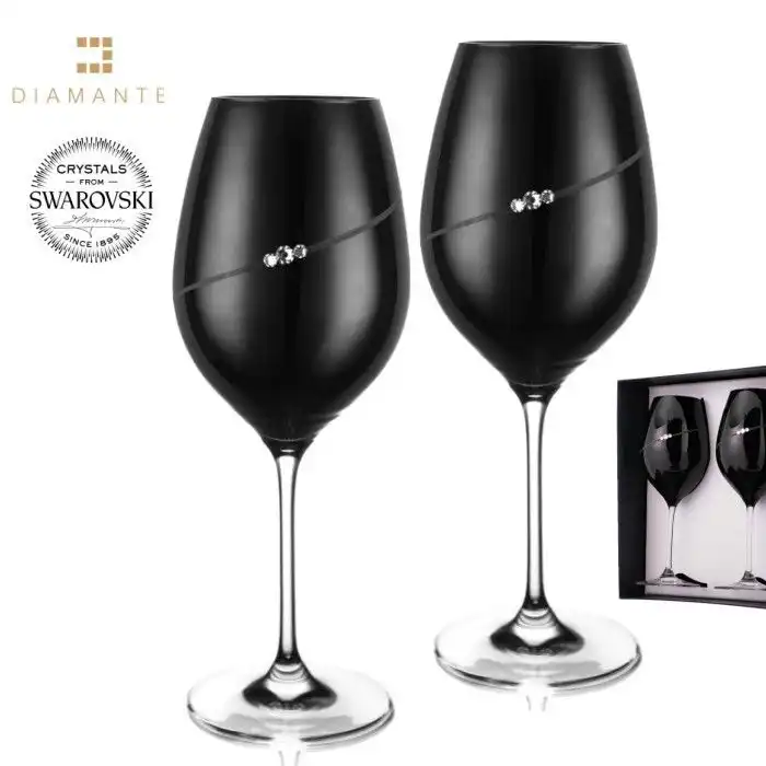 Luxusní Sklenice na červené víno Black Diamante v sadě 2 ks vynikají černým provedením a ručním zdobením křišťály Swarovski. Ideální dárek pro milovníky vína i designu.