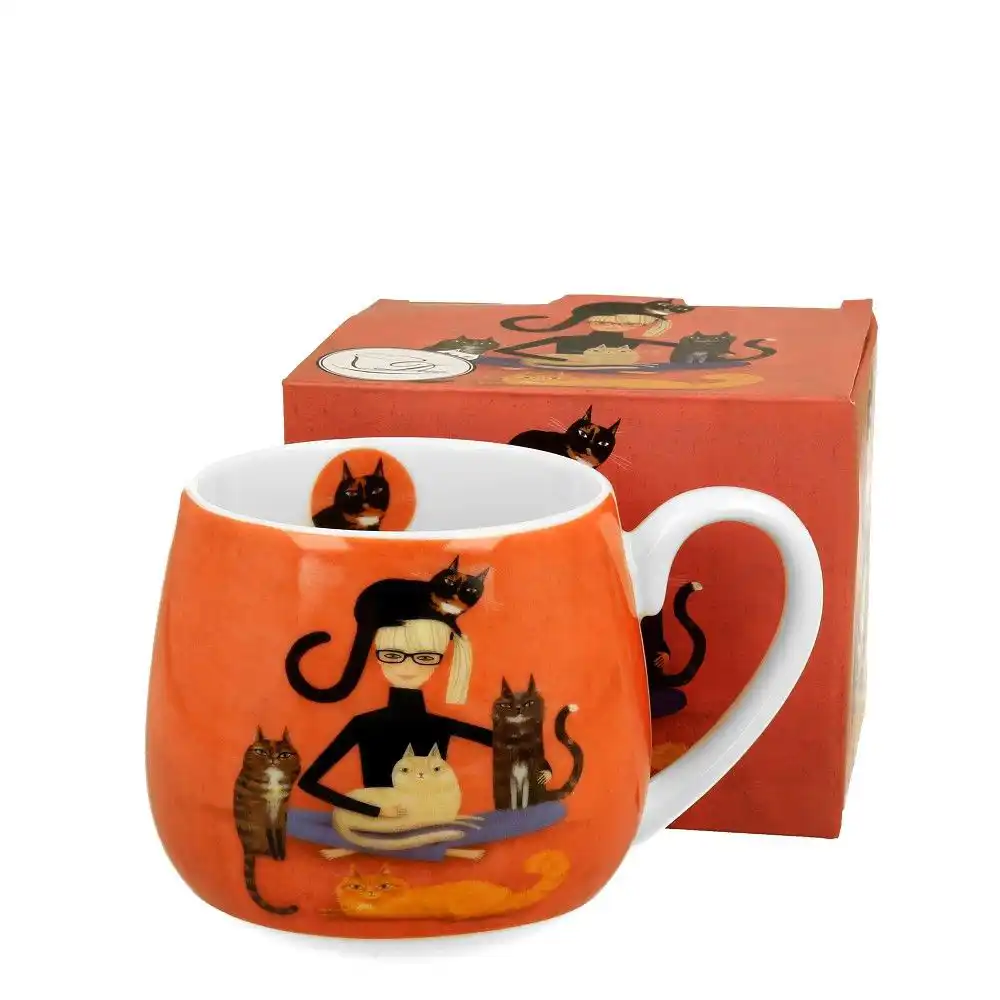 Baňatý hrnek kočky je ideálním dárkem pro každého milovníka koček, pohodové atmosféry a poctivého ranního čaje nebo voňavé kávy. Tento porcelánový hrnek o objemu 430 ml zaujme na první pohled svým baňatým tvarem, který skvěle padne do ruky, a unikátním dekorem – usměvavé dámy obklopené hravými kočkami.
