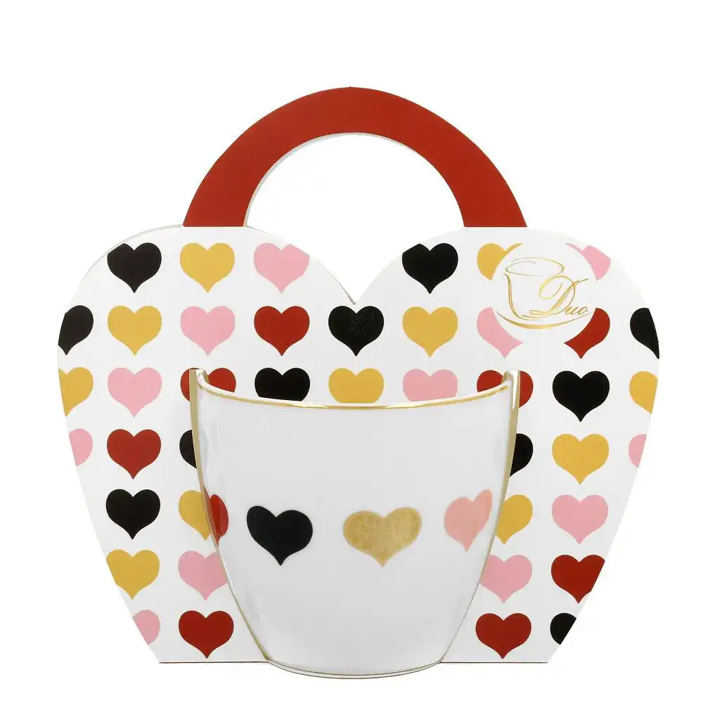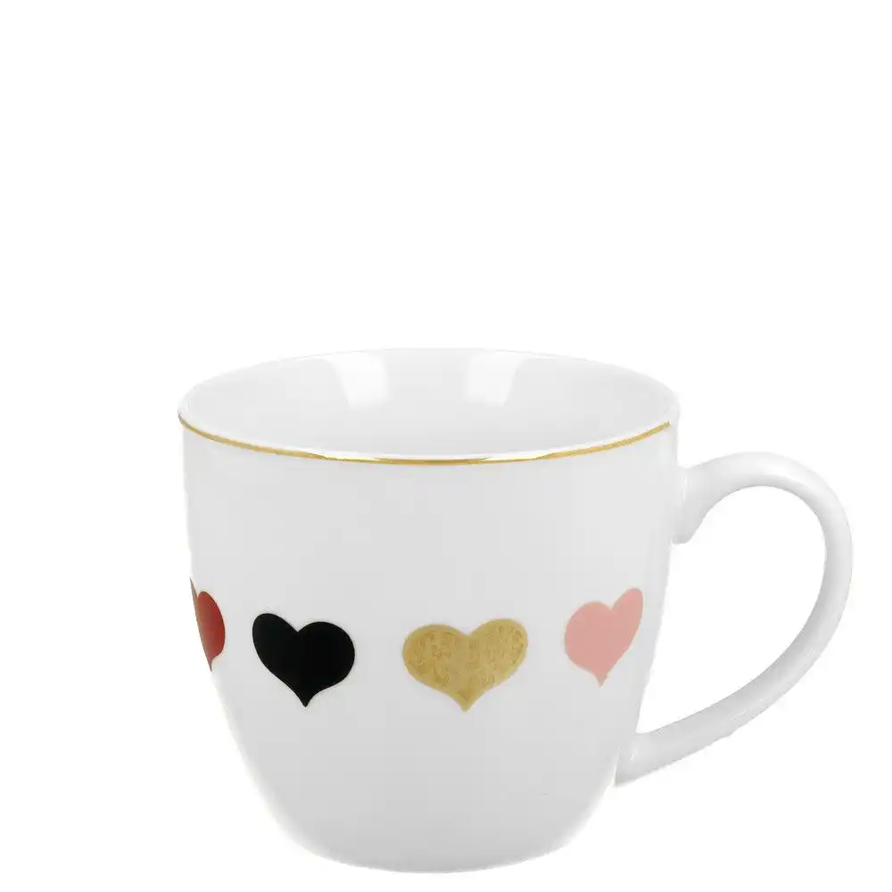 Porcelánový hrnek na kávu nebo čaj s oblíbeným romantickým dekorem barevných srdíček. Pro běžné používání se hodí tento hrnek a atraktivním dekorem barevných srdcí a zlatou linkou po okraji. Hrnek je vyrobený z kvalitního porcelánu s je přizpůsoben umývání v myčce nádobí i mikrovlnné troubě. Hrnek je zabalen v jednoduchém obalu a tak je připraven okamžitě posloužit jako pěkný dárek pro vaše přátele, kolegy nebo blízké. Krásný hrnek se zlatým proužkem a barevnými srdíčky udělá vždy radost všem, kteří rádi používají hezké věci. Porcelánový hrnek vytvoří příjemnou a pohodovou atmosféru při posezení s rodinou a přáteli. Uvařte si čaj nebo kávu a dopřejte si chvilku odpočinku a rozjímání.
