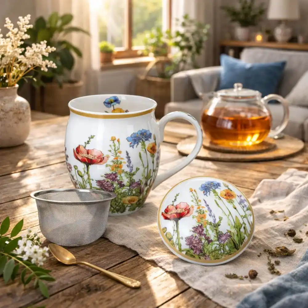 Porcelánový hrnek na čaj se sítkem a pokličkou s dekorem Květinová symfonie přináší pohodlnou přípravu sypaného čaje v elegantním baňatém tvaru, který dobře drží teplo a příjemně padne do ruky. Objem 450 ml nabízí ideální velikost pro každodenní pití čaje doma i v práci, zatímco nerezové sítko umožňuje snadné louhování bylin, ovocných směsí i klasických čajových lístků.