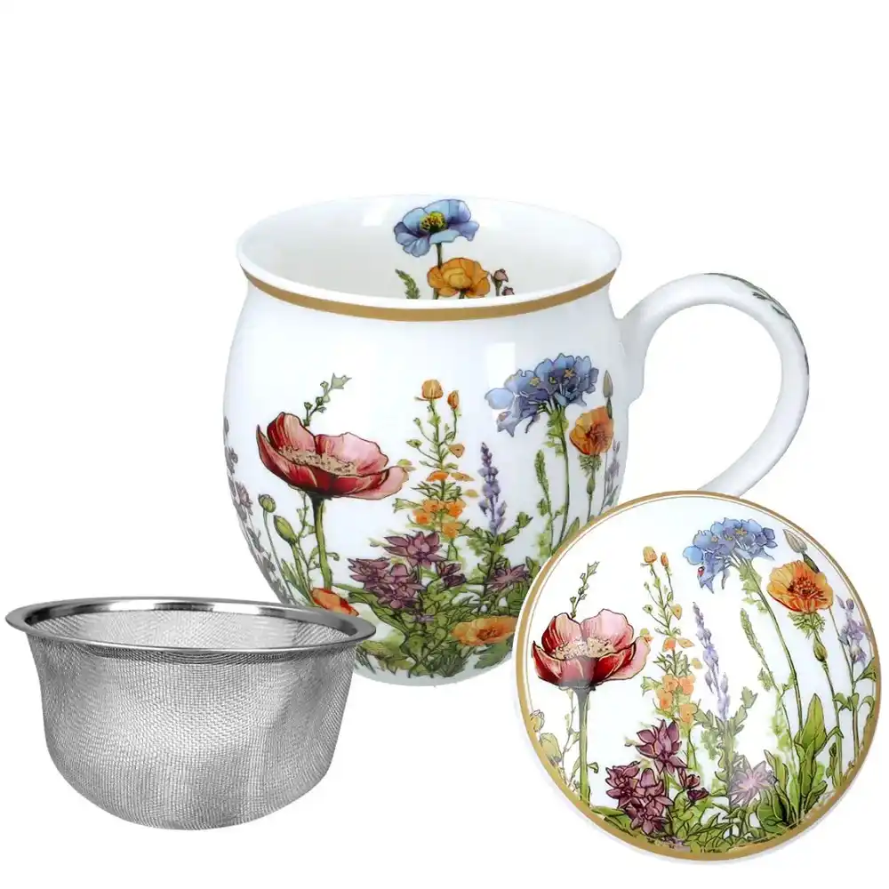 Elegantní baňatý hrnek na čaj se sítkem Květinová symfonie 450 ml