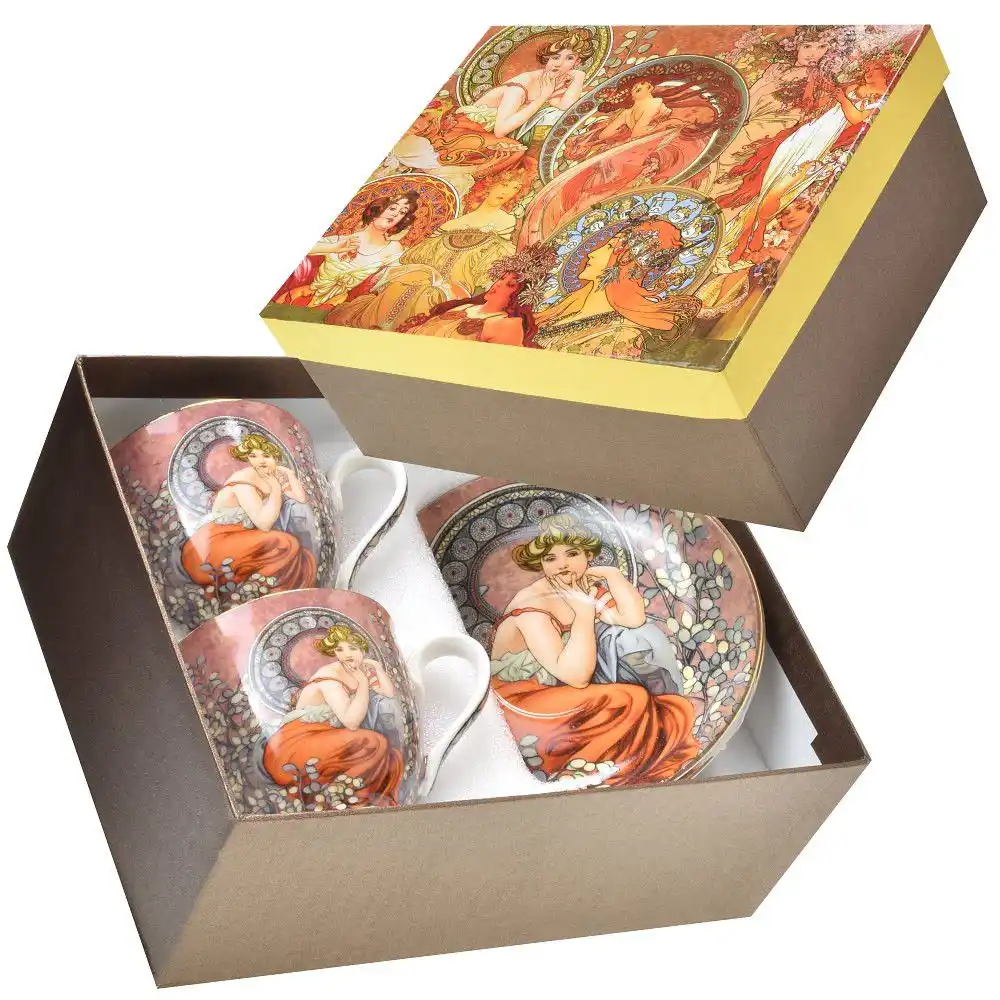 Souprav šálků s podšálkem Mucha – Topas v dárkové krabičce je symbolem elegance, tradice a výjimečného řemeslného umění. Vychutnejte si kávu nebo čaj s uměleckým příběhem přímo u vás doma!