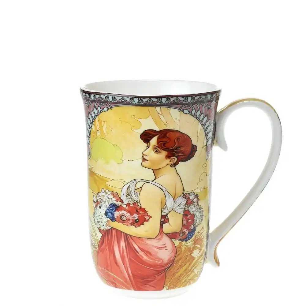 Porcelánový hrnek Mucha s dekorem Léto přináší na váš stůl atmosféru slunných a teplých dnů zachycenou v secesním stylu. Alfons Mucha vytvořil obraz plný života, květin a ženské elegance, který perfektně zdobí povrch hrnku. Tento motiv vyzařuje pozitivní energii a přináší svěžest každému nápoji.