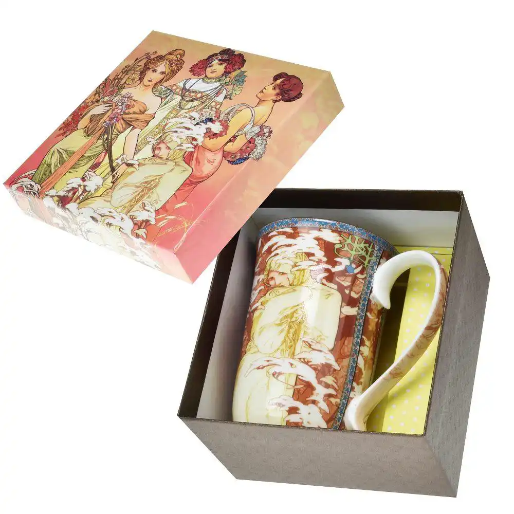 Každý hrnek Mucha s dekorem Zima dodáváme v elegantní dárkové krabičce s motivem ladícím k designu hrnku. Toto balení chrání porcelán během přepravy a zároveň jej proměňuje ve stylový a hodnotný dárek pro každého milovníka umění.