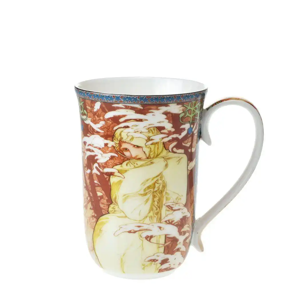Porcelánový hrnek Mucha s dekorem Zima přináší na váš stůl jemnost a klid zimního období, zachycené v mistrovském secesním stylu. Alfons Mucha vytvořil obraz s motivy zasněžené krajiny a ženské postavy, které evokují ticho a krásu zimní přírody. Tento motiv zdobí celý povrch hrnku a dodává mu jedinečný charakter.