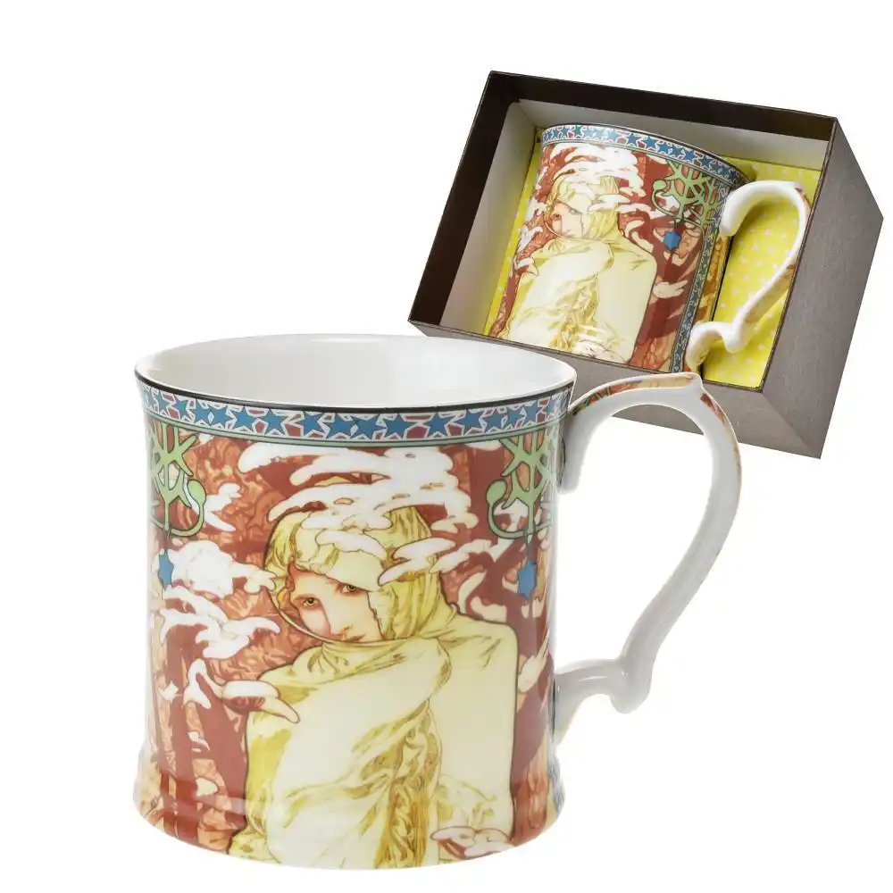 Porcelánový hrnek Mucha s dekorem Zima nabízí elegantní motiv zimy, velkorysý objem 360 ml a kvalitní provedení. Luxusní dárkové balení z něj dělá ideální dárek pro milovníky umění.