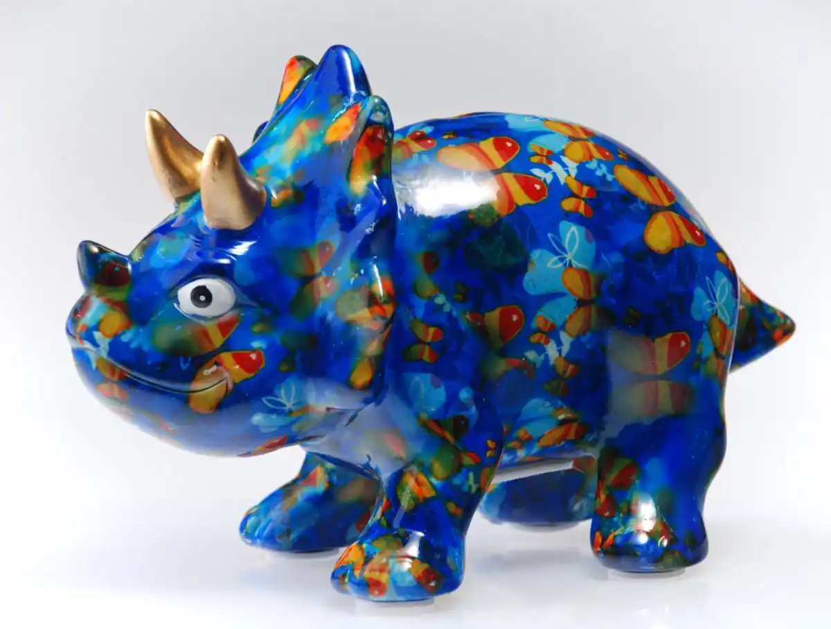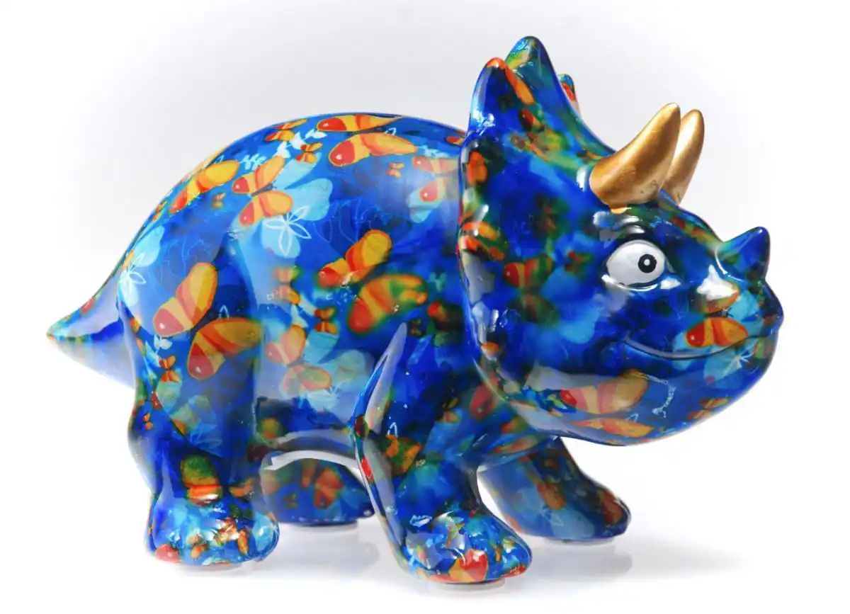 Kasička dinosaurus modrý se zlatými růžky a dekorem motýlů. Originální keramická pokladnička Pomme Pidou, která učí děti spořit s radostí.