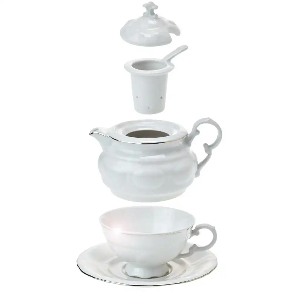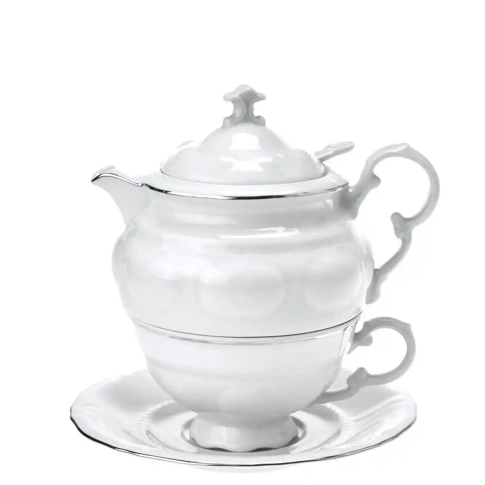 Konvička na čaj – set pro jednoho spojuje tradiční české řemeslo s jemnou noblesou platinové dekorace. Tento ručně litý porcelánový set je jako stvořený pro ty, kdo si chtějí čaj opravdu vychutnat – bez spěchu, stylově a jen pro sebe. Nadčasová souprava obsahuje konvičku s víčkem, šálek, podšálek a porcelánové sítko. Vše v harmonickém designu s objemem konvičky 400 ml – ideální porce pro klidné čajové chvilky.