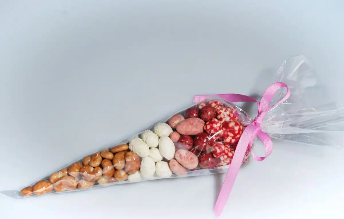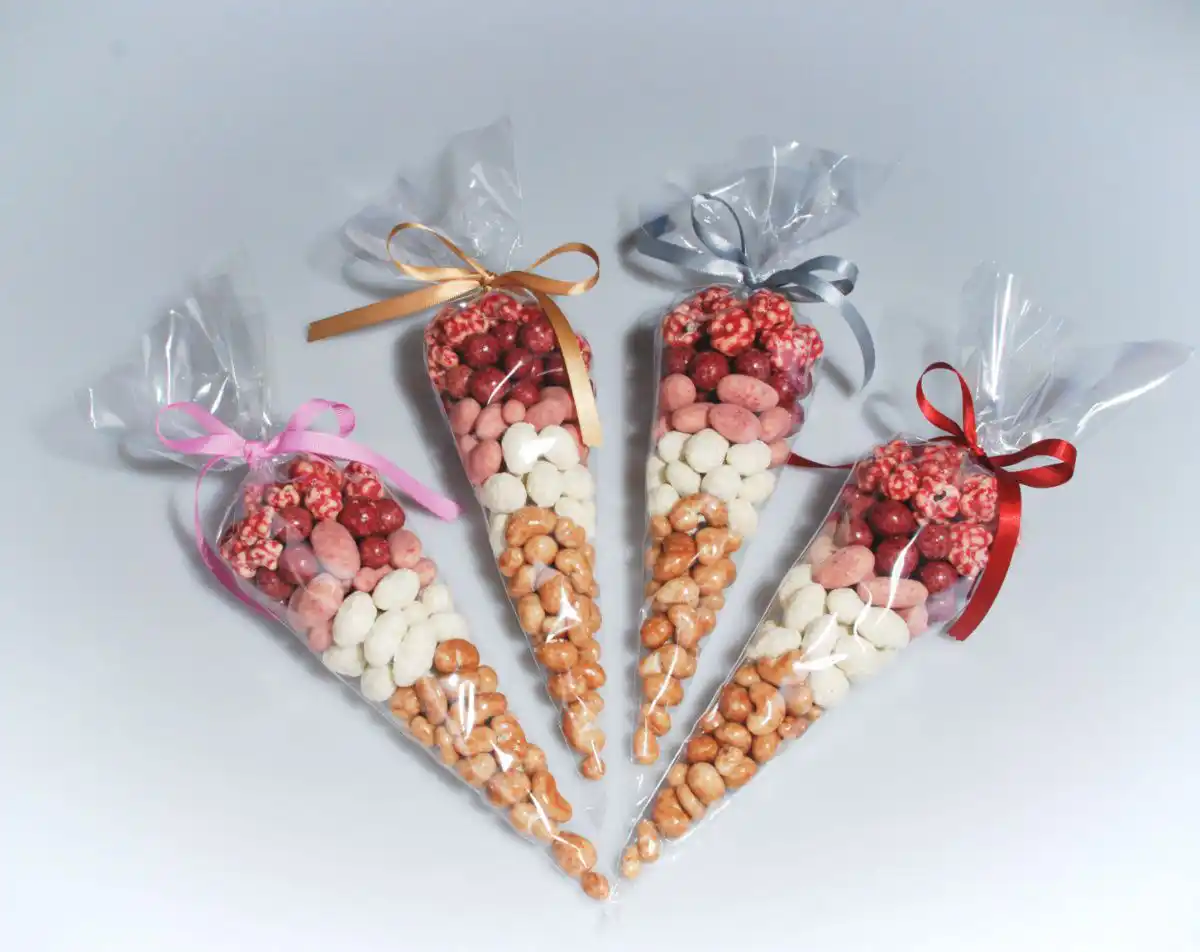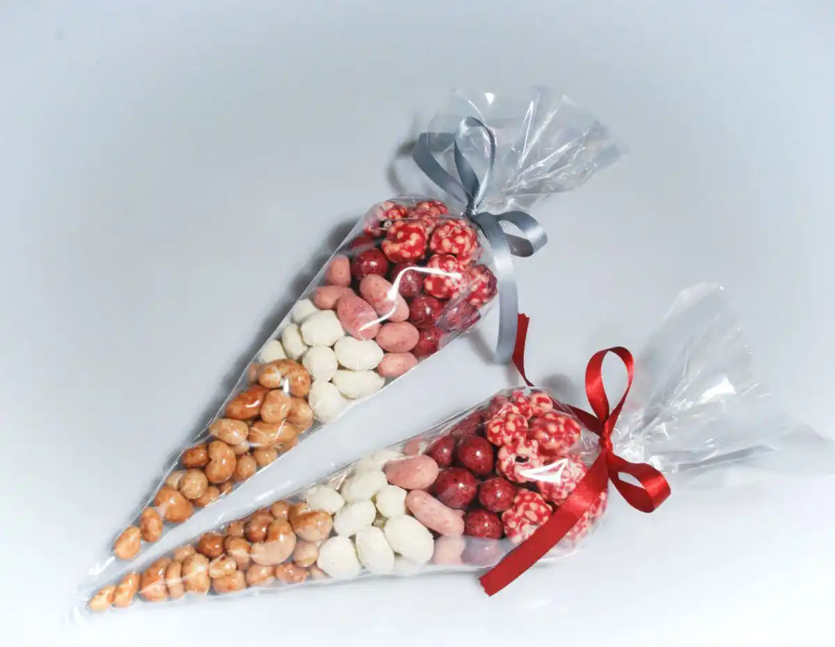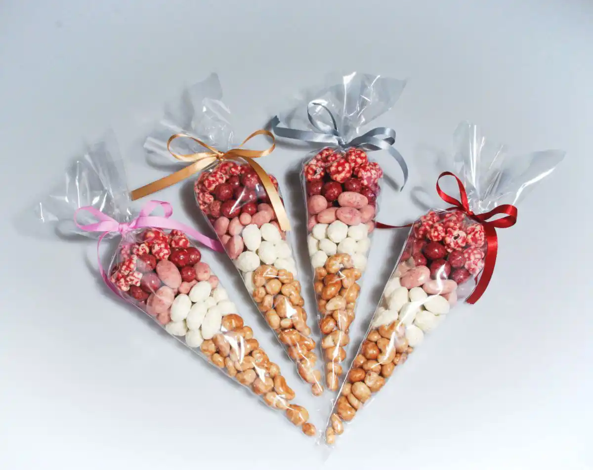 Každý druh pečlivě vybraných ořechů a ovoce nabízí unikátní chuť. Kešu v tiramisu polevě přináší jemnou sladkost s kávovým nádechem. Mandle Rafaelo kombinují bílé čokoládové a kokosové tóny, které osloví milovníky tradičních sladkostí. Mandle v malinové bílé čokoládě nabízejí jemnou ovocnou chuť s krémovou čokoládou. Lyofilizovaný černý rybíz a maliny v bílé čokoládě dodávají směsi jemně kyselý kontrast a atraktivní vizuální efekt. Barevné kombinace a různé textury dělají z kornoutu originální sladký dárek.