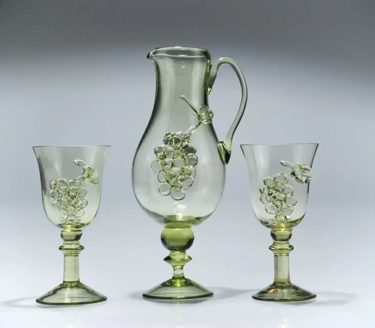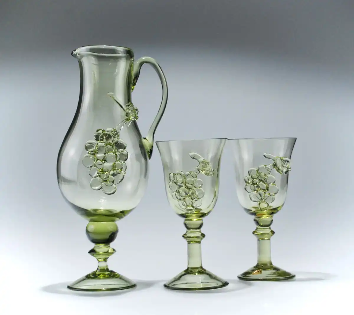 Zkušení skláři v Novém Boru, kde se sklářství stalo součástí kulturního dědictví UNESCO, tvoří sklenice a džbán s důrazem na kvalitu a precizní zpracování. Zelené sklo působí harmonicky, elegantně a přirozeně. Plastický motiv vinného hroznu, který mistři skláři ručně aplikují, dodává celé soupravě výjimečný umělecký rozměr.
