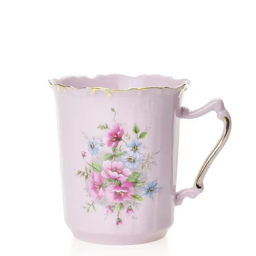Každý pohled na tento hrnek potěší – růžový porcelán v něžném tónu působí lehce, květinový dekor září barvami a krajkový okraj dodává šálku romantický ráz. Zlatý proužek orámuje horní linii a zároveň krásně doplňuje ouško. Tvar hrnku působí ladně a celistvě, což podtrhuje jeho celkovou harmonii.