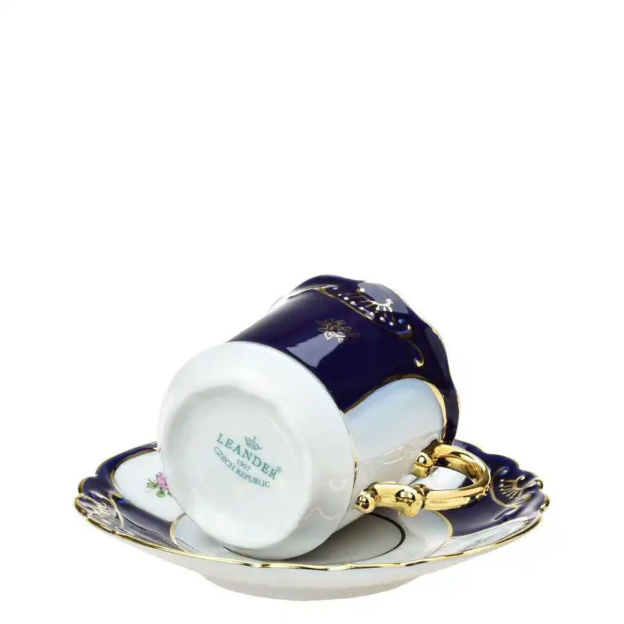 Luxusní šálek s podšálkem – kobalt, zlato a rozkvetlá krása