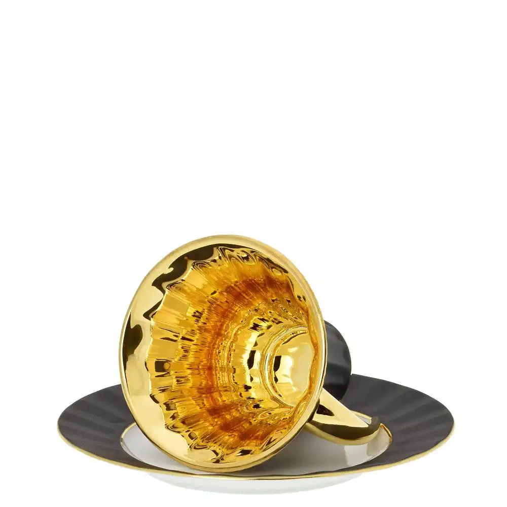 Šálek má ideální velikost pro silné espresso, černý čaj nebo rituální nápoj po večeři. Zlatý vnitřek se leskne při každém napití a promění běžný okamžik v malý svátek. Povrch je na dotek hladký, černý porcelán působí luxusně a přitom zůstává praktický. Podšálek drží šálek přesně tam, kde má být – stabilně a s elegancí.