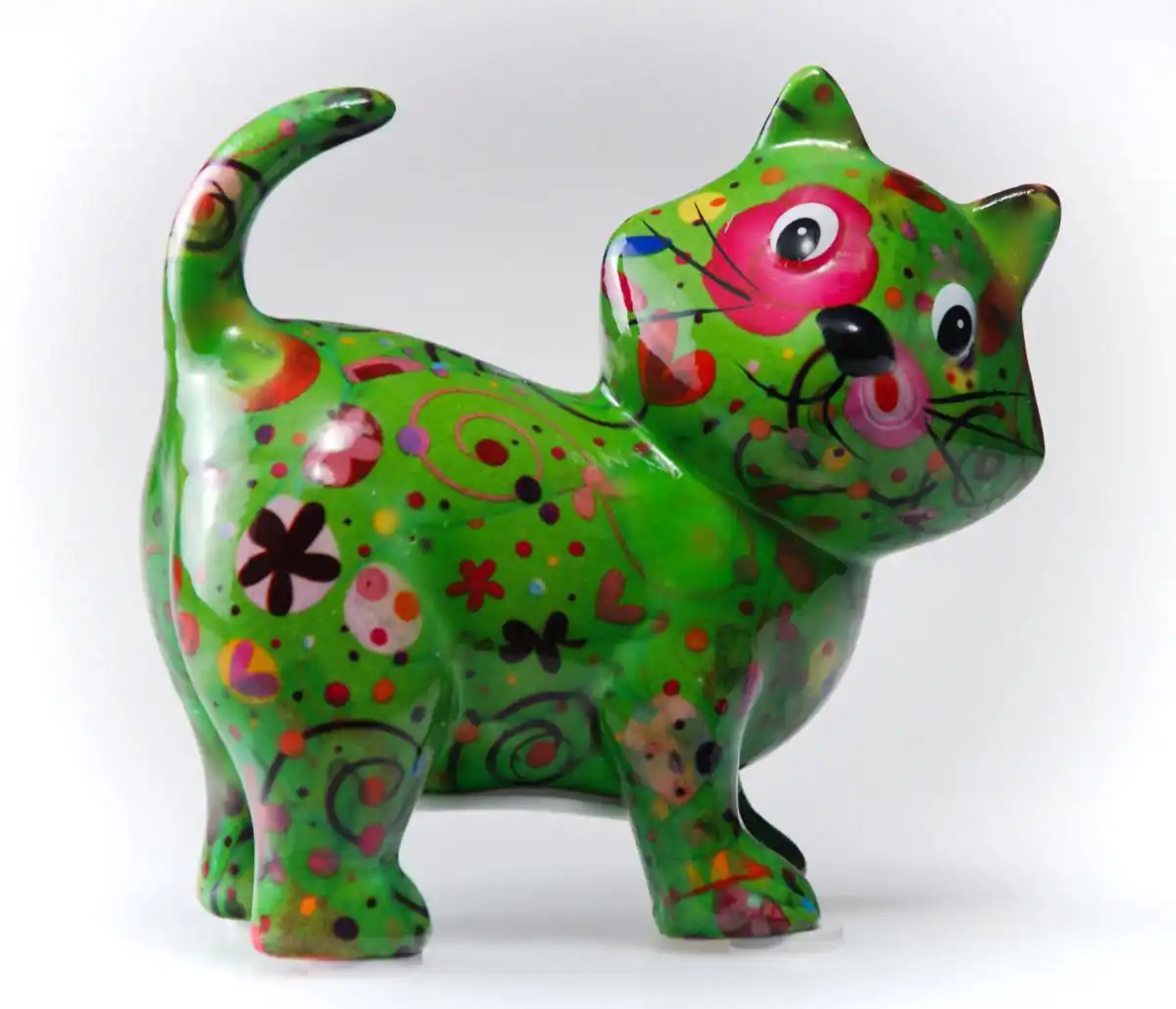 Zelená pokladnička ve tvaru kočky – keramická kasička s dekorem