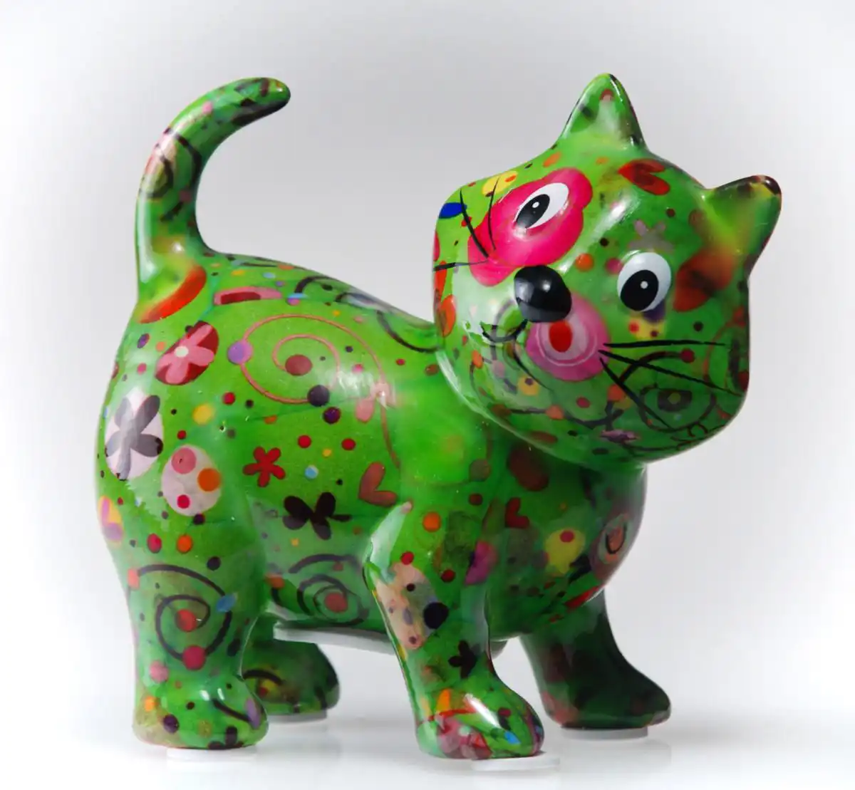 Zelená pokladnička na peníze ve tvaru kočky s dekorem kytiček. Keramická kasička s otvorem pro mince hravě učí děti šetřit.