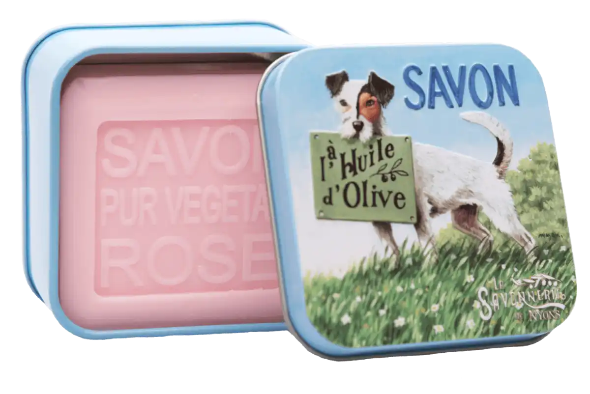 Každé přírodní mýdlo růže je uloženo v krásné plechové dóze s motivem psa. Dóza je nejen estetická, ale i praktická – chrání mýdlo před vlhkostí a nečistotami. Snadno ji využijete i na cesty nebo jako dekorativní prvek v koupelně. Design potěší každého milovníka zvířat i originálních dárků.