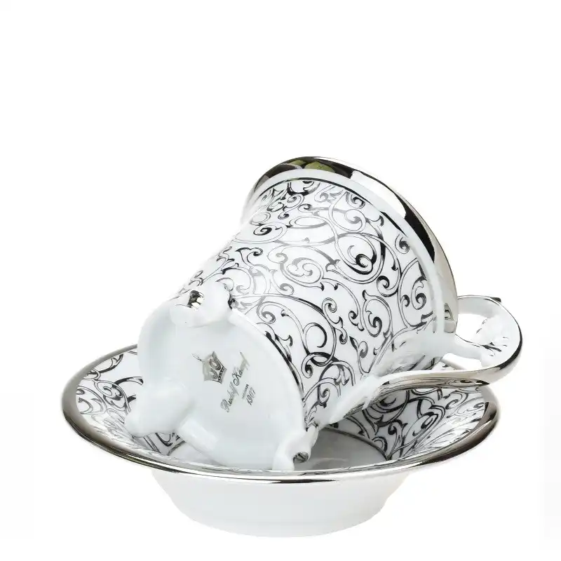 Jemná platinová linka zvýrazňuje obrys šálku i podšálku. Lesklý kovový akcent odráží světlo a vytváří sofistikovaný kontrast s bílým porcelánem. Dekor působí decentně, přesto výrazně.