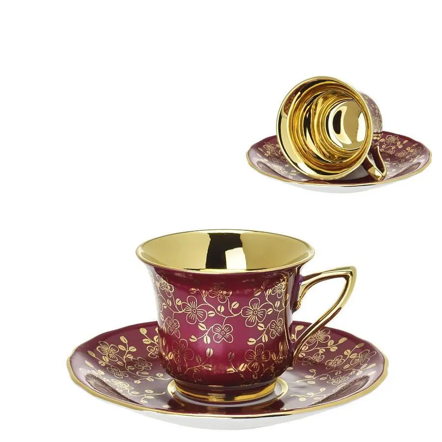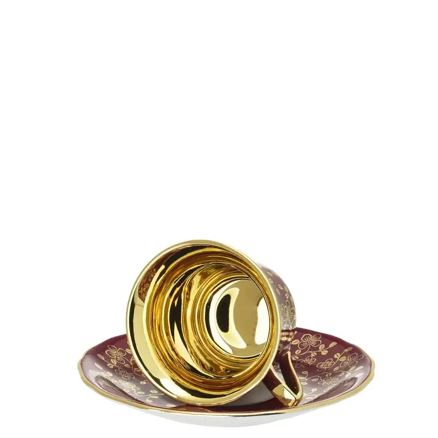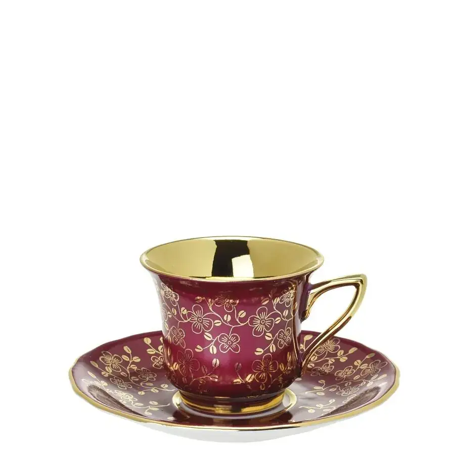 Luxusní šálek s podšálkem v bordové barvě se zlatými prvky a zlaceným vnitřkem okouzlí na první pohled. Tento porcelánový klenot propojuje smyslnou barevnost, ruční zpracování a slavnostní výraz. Je ideální volbou pro chvíle, které si zaslouží výjimečný rámec.
