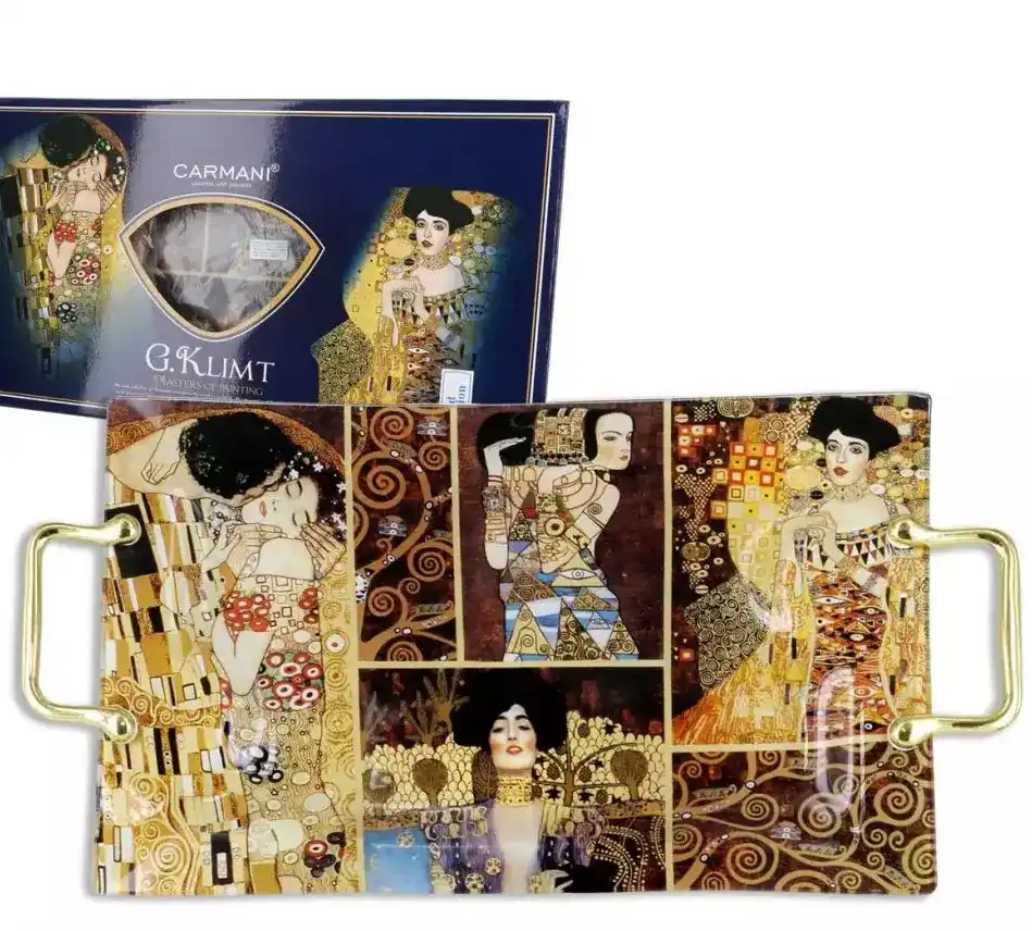 Podnos s koláží Klimtových obrazů dobře doplní porcelán nebo dekorativní doplňky s uměleckými motivy. Kombinace více výrobků inspirovaných Klimtovou tvorbou vytvoří harmonický styl stolování.