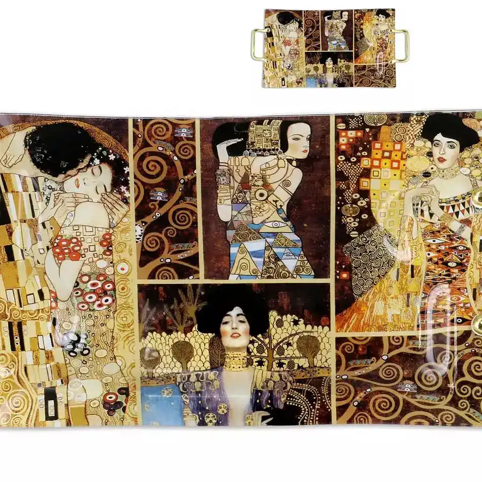 Velký skleněný podnos s koláží obrazů Gustava Klimta spojuje praktickou funkci a výrazný design inspirovaný světem výtvarného umění. Prostorný rozměr, dekorativní skleněný povrch a kovové úchytky vytvářejí podnos, který se hodí pro každodenní servírování i slavnostní příležitosti.
