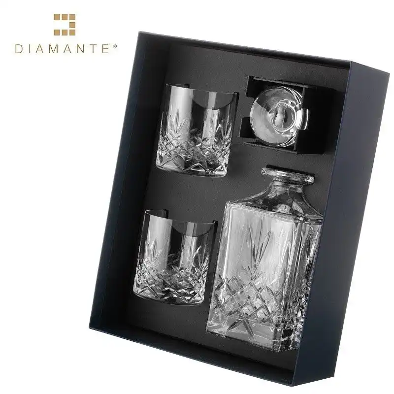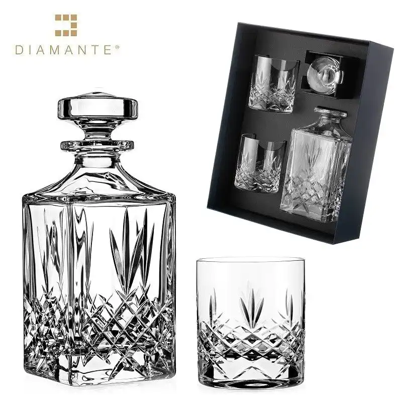 Sklenice a karafa na whisky tvoří luxusní křišťálovou sadu v anglickém stylu, která zahrnuje 2 sklenice 310 ml a karafu 700 ml. Elegantní dárková krabice z ní dělá ideální dárek pro slavnostní příležitosti.