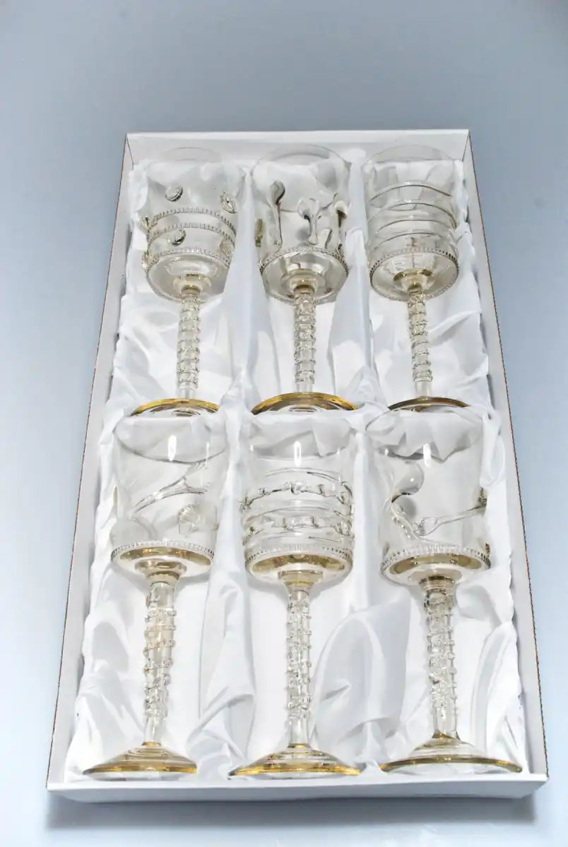 Každá sklenice v této sadě nese jiné zdobení. Různorodé dekorativní prvky vycházejí z historických motivů českého sklářství. Díky tomu získává celá kolekce osobitý charakter a působí velmi autenticky. Odlišné zdobení zároveň podtrhuje hodnotu ruční práce.
