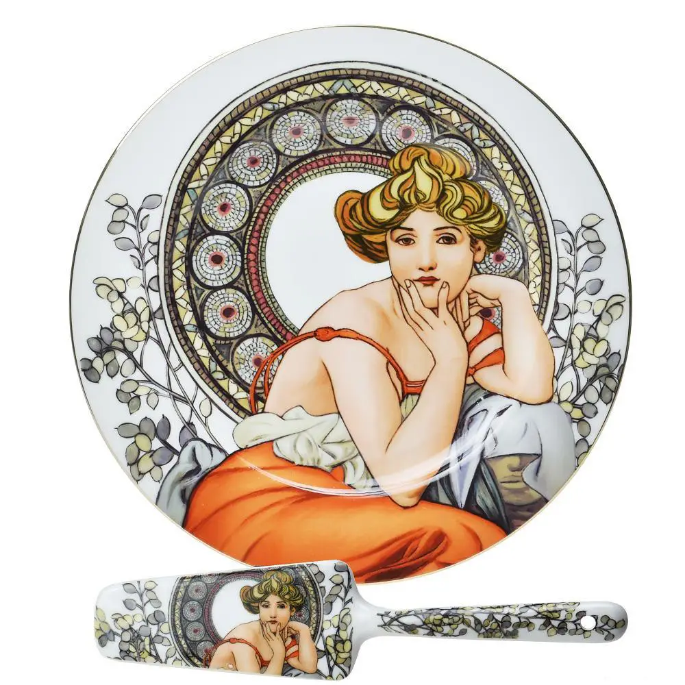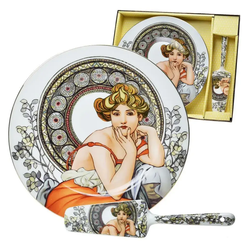 Dortový talíř 27 cm s lopatkou Alfons Mucha-Topaz (světlý podklad)