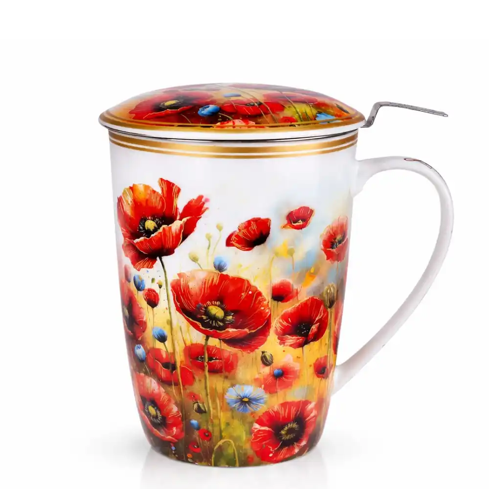 Velký porcelánový hrnek na čaj se sítkem a pokličkou Vlčí máky 600 ml