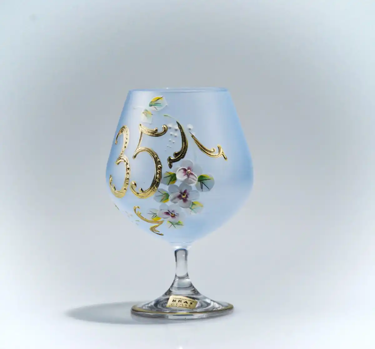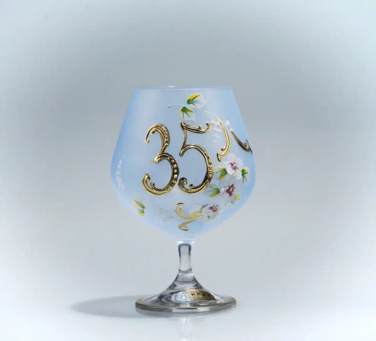 Každá sklenice k 35. narozeninám je originál, který vzniká v rukou zkušených českých sklářů. Modré sklo působí elegantně, a zároveň moderně. Zlaté číslo 35 září na čelní straně sklenice a doplňují ho drobné smaltované kvítky, jejichž jemná barevnost dodává celé kompozici noblesu i hravost.