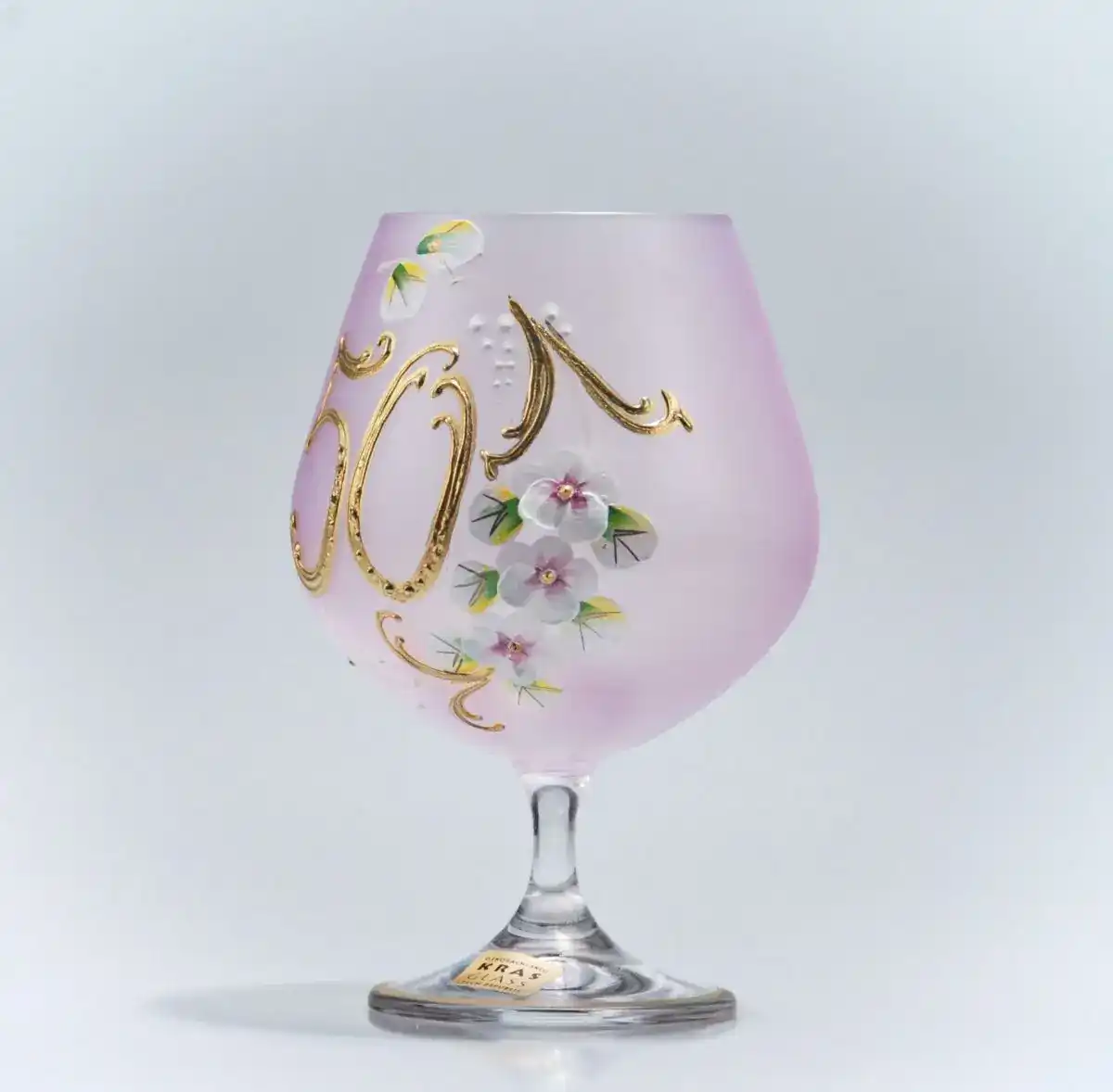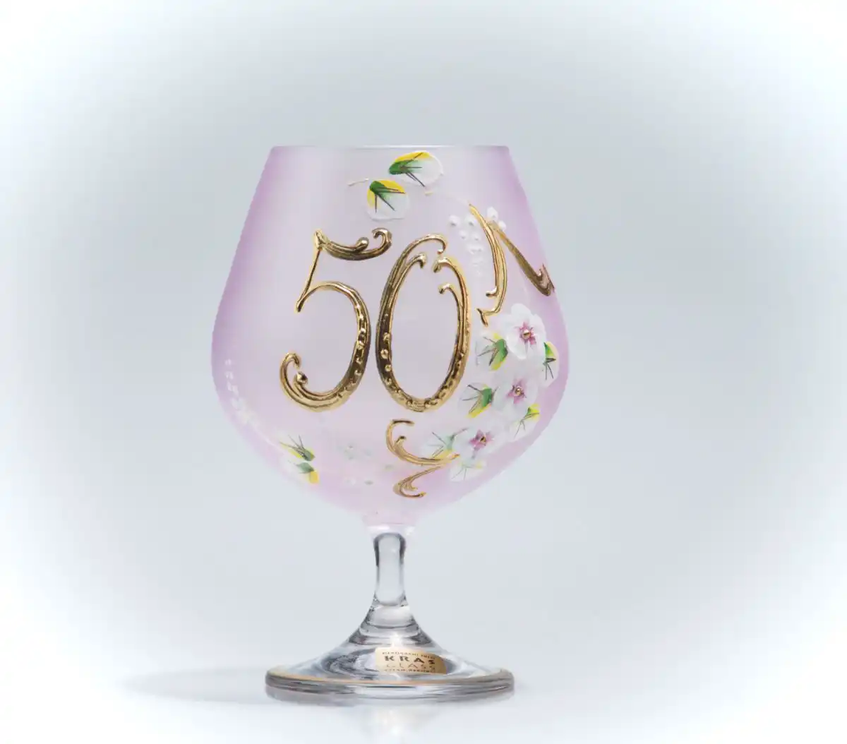 Design sklenice okouzlí na první pohled. Jemná růžová barva navozuje pocit něhy, lásky a radosti. Do středu kompozice zasazené zlaté číslo 50 jasně vyjadřuje, k jaké příležitosti je sklenice určena. Drobné kvítky z vysokého smaltu, které sklenici dekorují, působí jemně a ručně zpracovaný dekor podtrhuje ženský půvab i originalitu dárku. Každý květ vzniká individuálně, bez použití šablon nebo strojového nanášení – právě proto má každá sklenice jedinečný charakter.