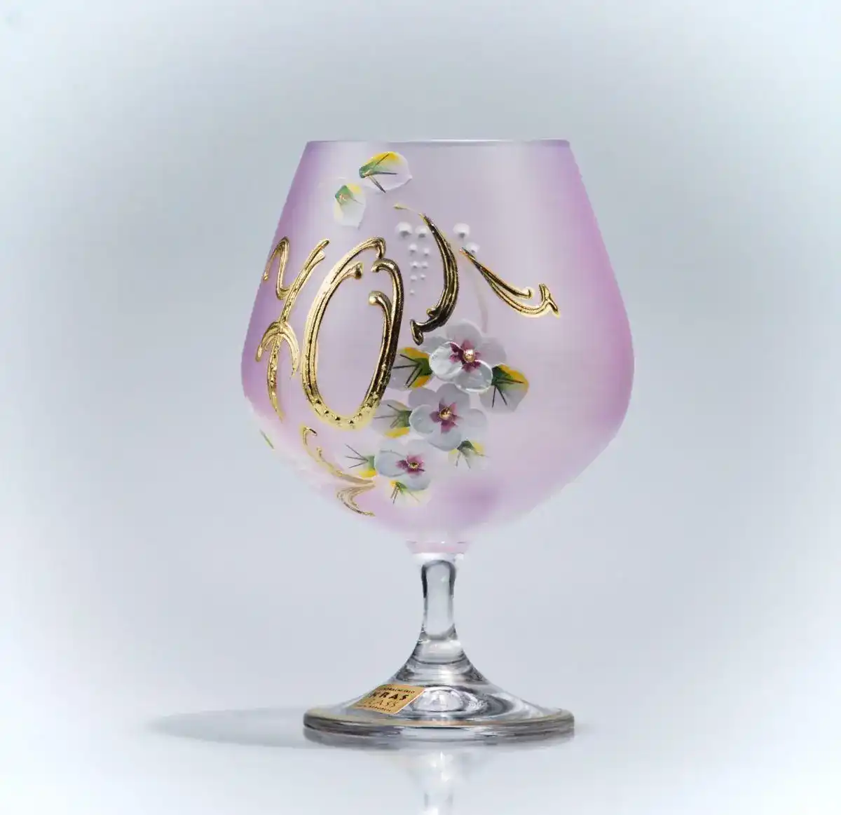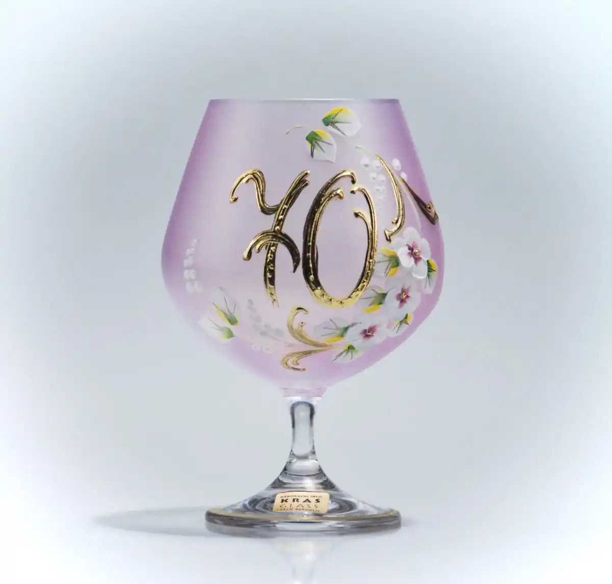 Růžová barva symbolizuje něhu, empatii a laskavost – tedy vlastnosti, které člověk ve věku 70 let ztělesňuje s noblesou. Dekor jemných kvítků vytvořených technikou vysokého smaltu dodává sklenici slavnostní a přesto jemný vzhled. Ručně malované číslo 70 je provedené s důrazem na detail a ozdobené decentním leskem.