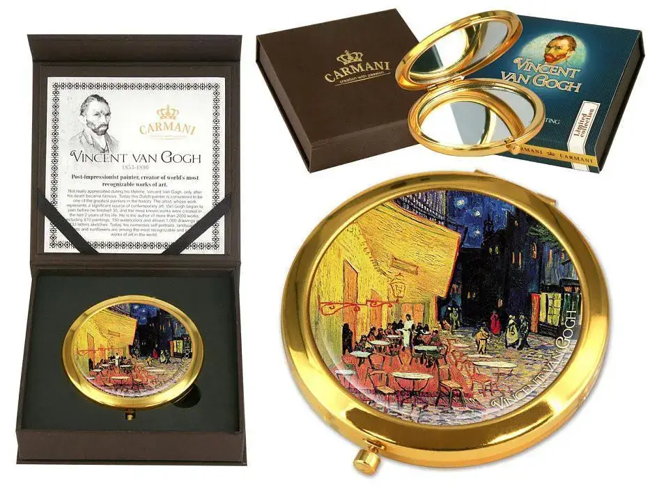Zaklápěcí zrcátko do kabelky s dekorem Terasa noční kavárny přináší praktické řešení pro každodenní kontrolu vzhledu a zároveň potěší milovníky umění. Tento elegantní doplněk snadno uložíte do kabelky, batohu i psaníčka, a kdykoliv ho máte po ruce.